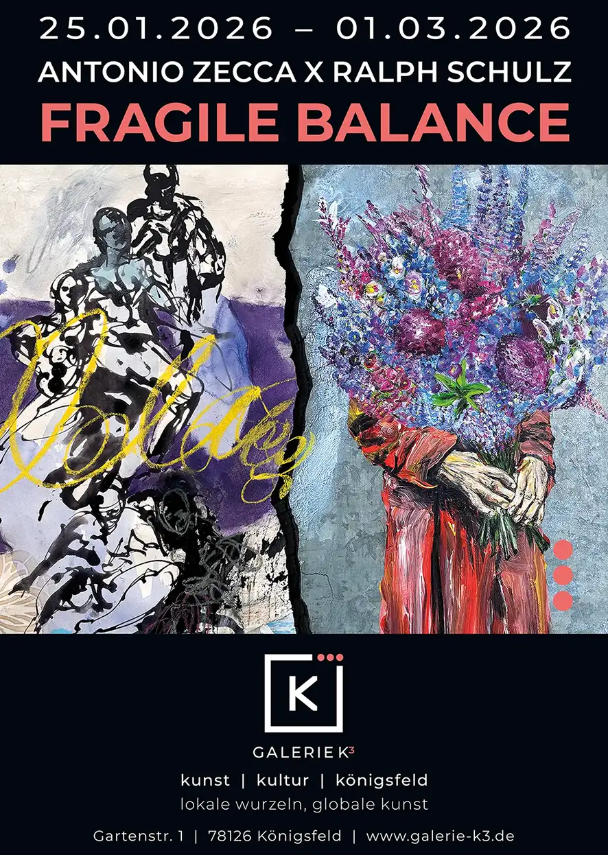 Herzlich willkommen in der Galerie K³ – dem kreativen Herz von Königsfeld im Schwarzwald! Tauchen Sie ein in eine Welt voller faszinierender Kunst, inspirierender Künstler und lebendiger Kultur. Als junger Galerist der Galerie K³ freue ich mich, Sie auf unserer virtuellen Plattform begrüßen zu dürfen, die das pulsierende Zentrum für zeitgenössische Kunst in unserer kleinen Gemeinde darstellt.